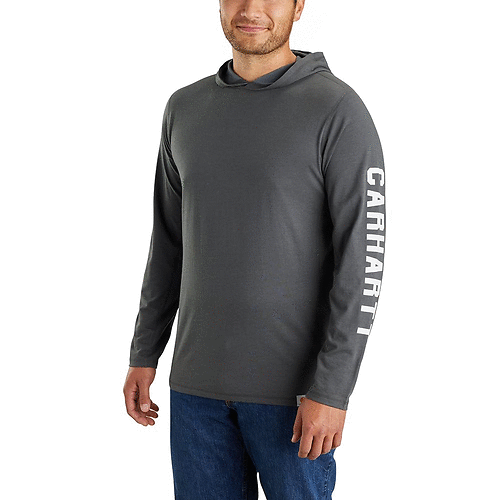 Carhartt Carbon Heather Medium Men’s Force Relaxed Fit Midweight Long-Sleeve Logo Graphic Hooded T-Shirt
